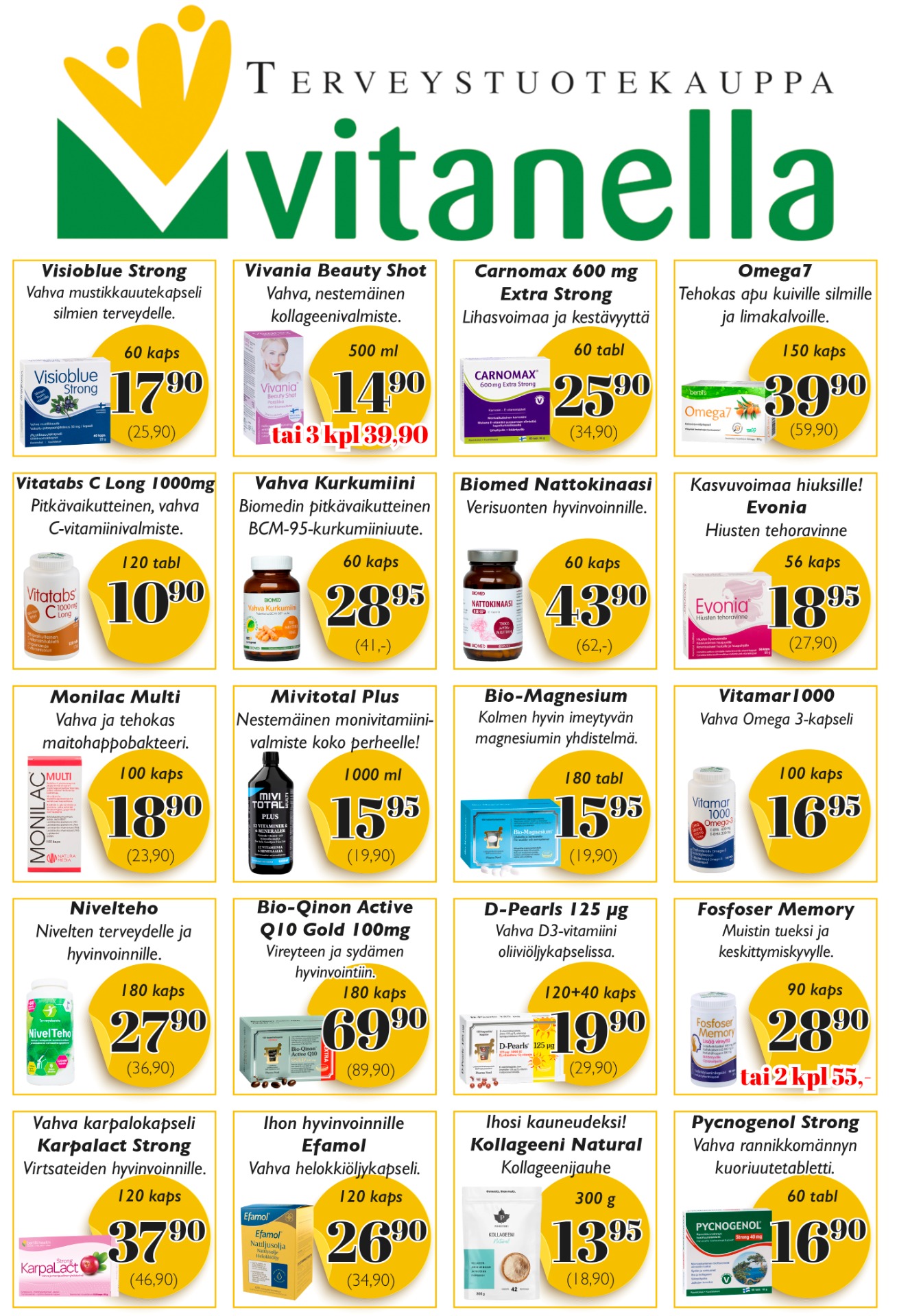 Vitanellan valikoimasta löydät luontaistuotteet, terveystuotteet ja ravintolisät jokaiseen tarpeeseen. Oli kyse sitten kalaöljystä, vitamiineista, magnesiumista, maitohappobakteereista tai rohdosvalmisteista, meiltä löydät varmasti tarpeisiisi sopivat tuotteet.